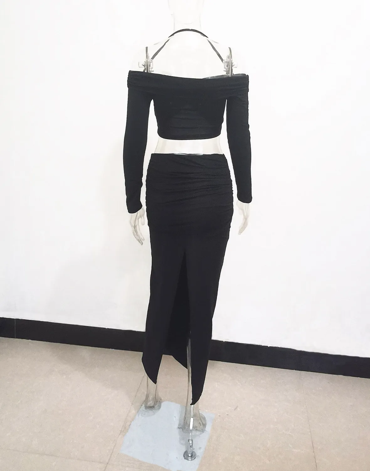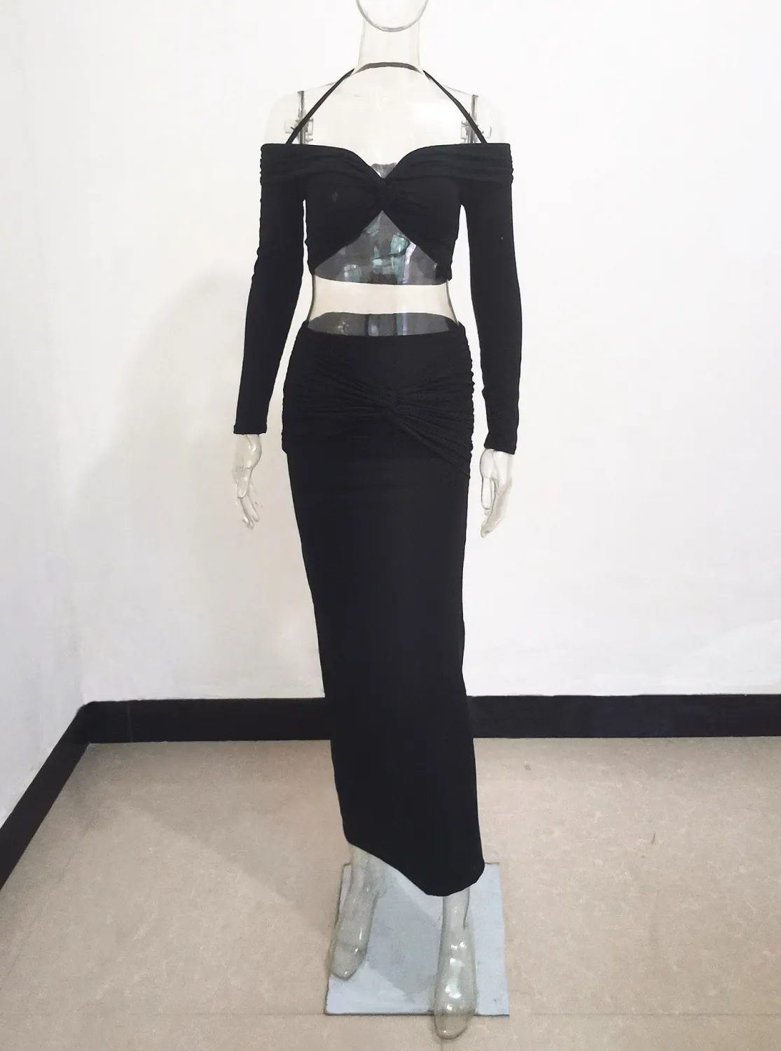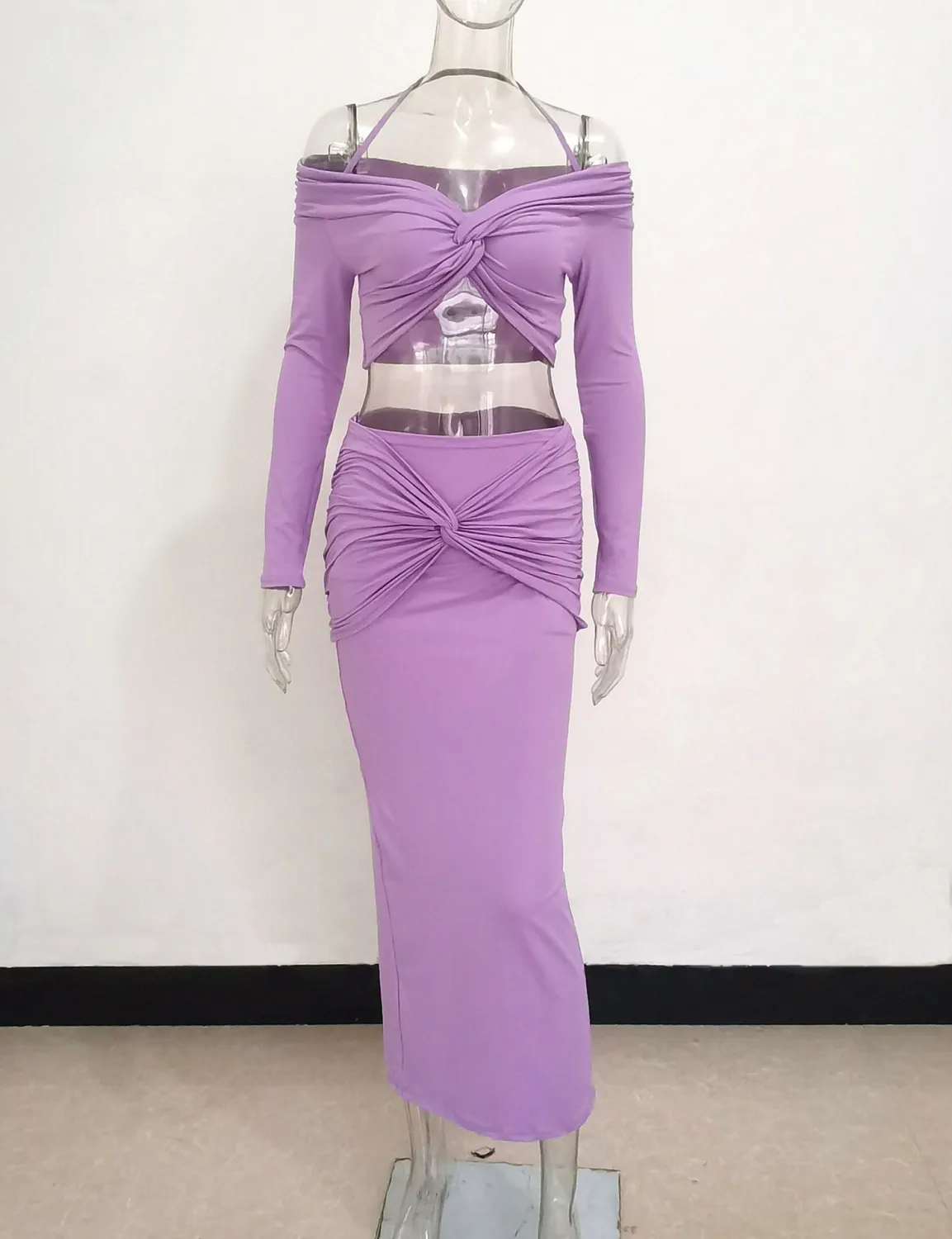 | Product Name | Fall Women Off Shoulder Halter Neck Long Sleeve Knot Crop Top+ Maxi Dress Two Piece |