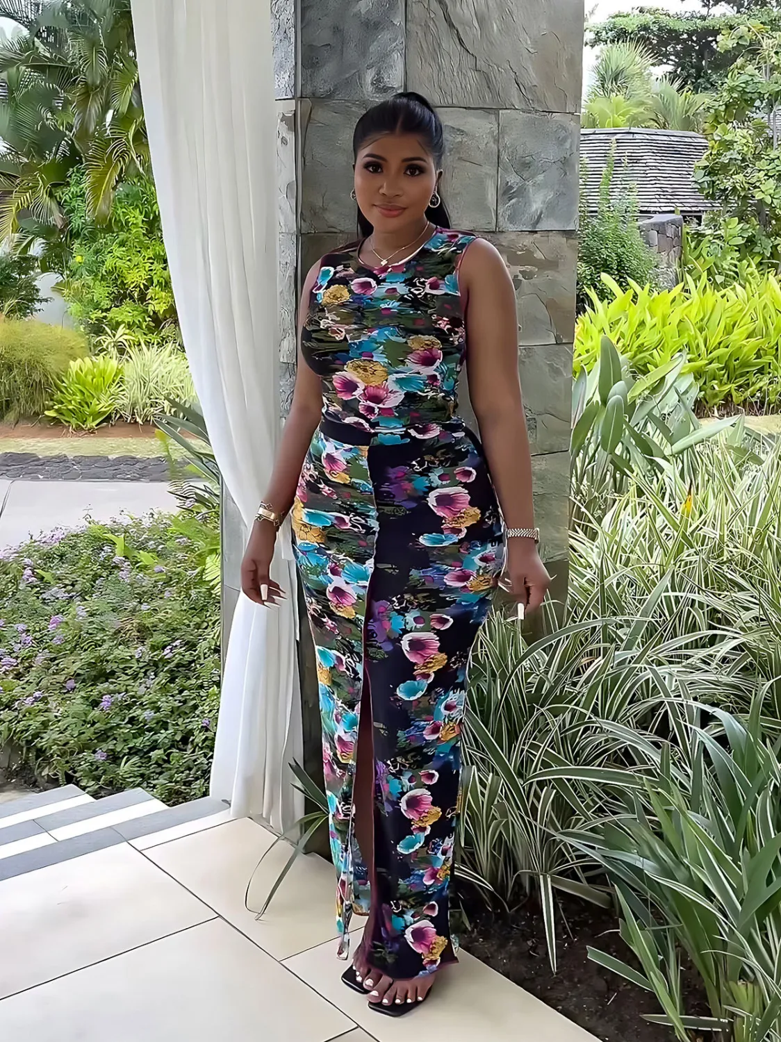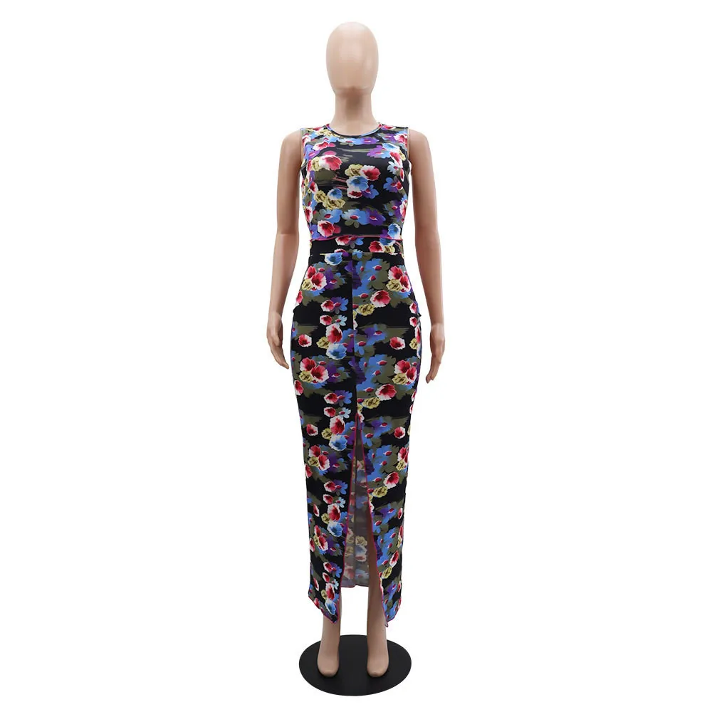 | Product Name | Fashionable floral Tank high-waisted long skirt two-piece set for women |