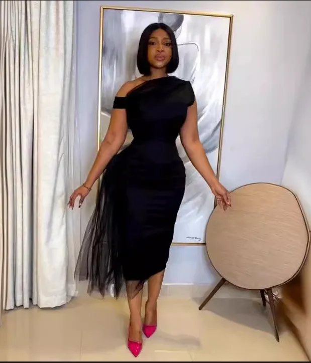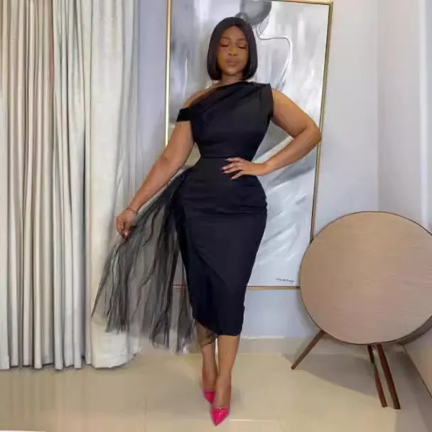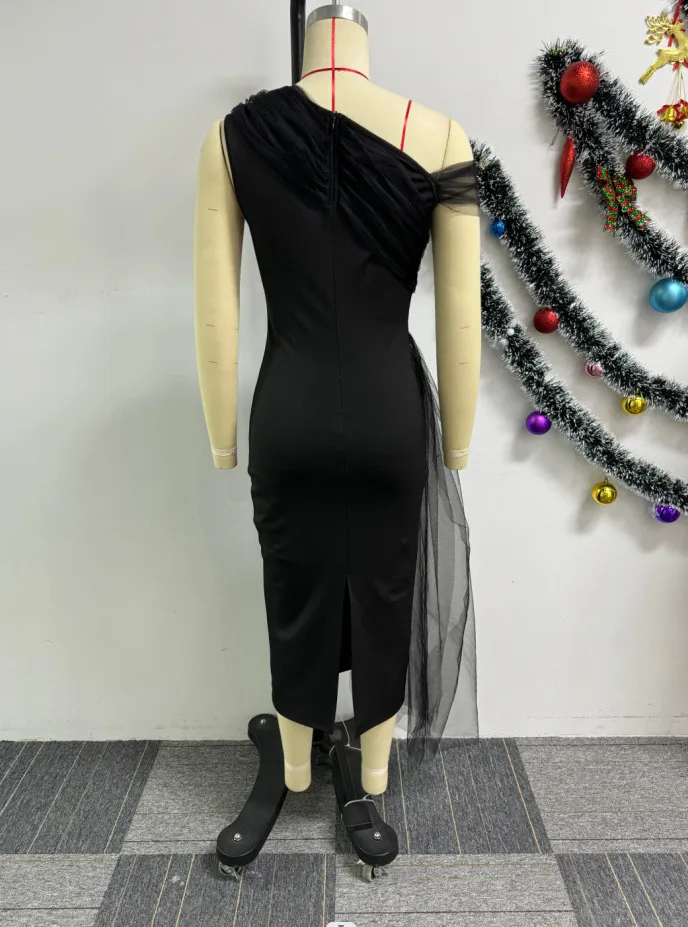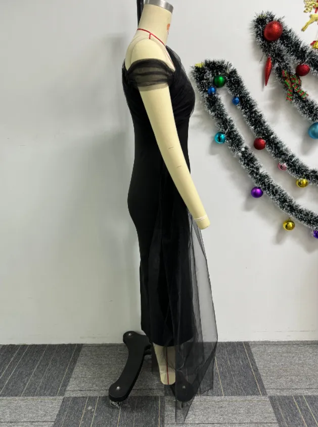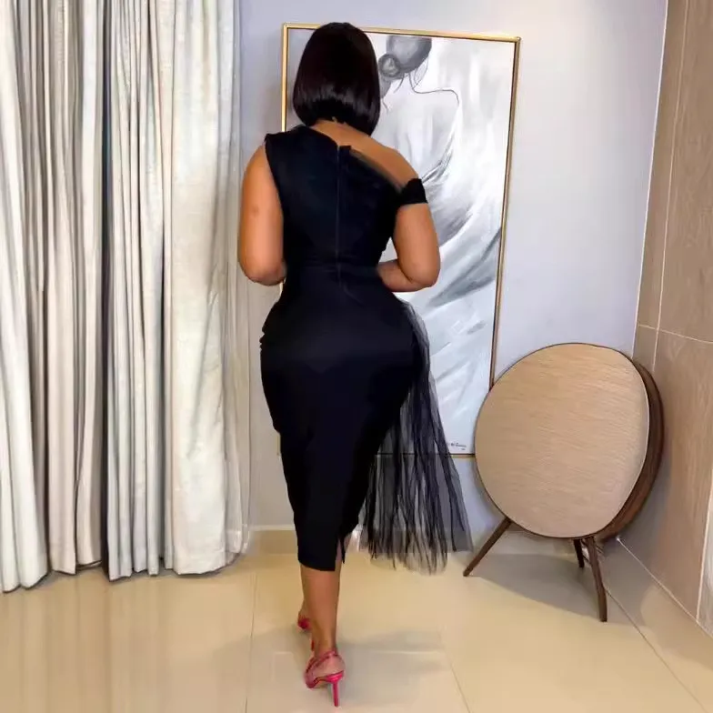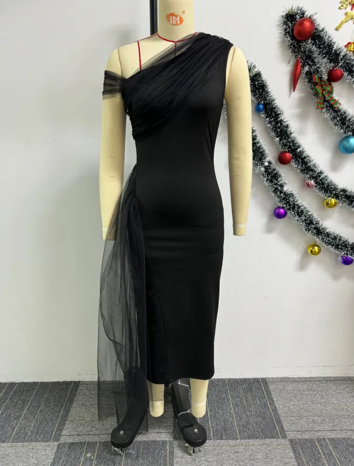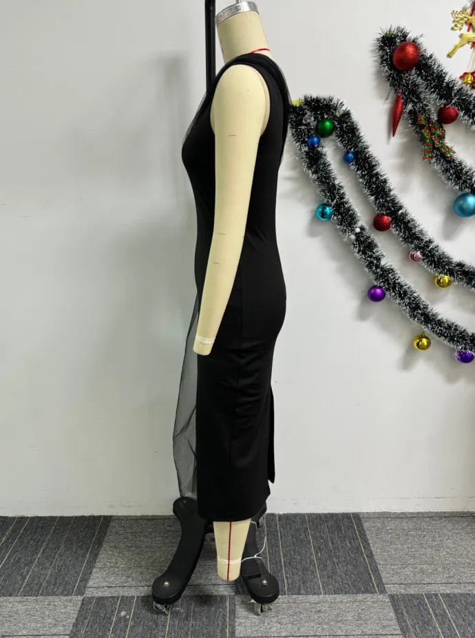 | Product Name | Mesh Patchwork Slash Shoulder Sleeveless Bodycon Dress |