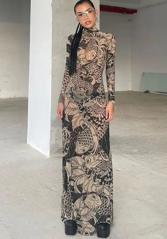 | Product Name | Sexy Fashion Printed Mesh Round Neck Long Sleeve Long Dress |