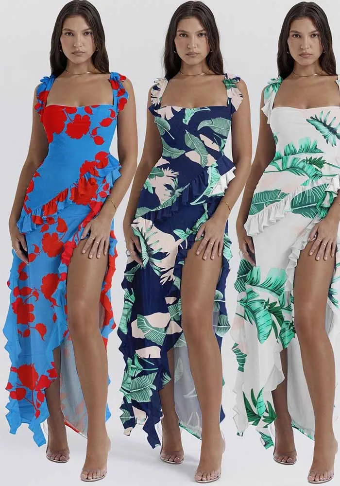 | Product Name | Sexy Printed Ruffle Strap Slit Long Dress |