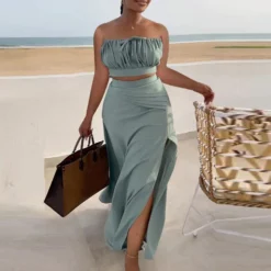 Solid Mesh See-Through Feather Lace-Up Strapless Tank Top Ruffled Midi Skirt Two Piece Set