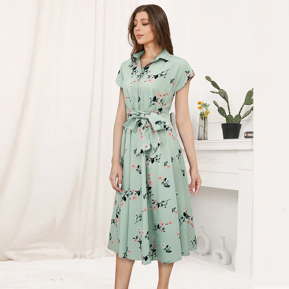 | Product Name | Summer Women’s Art Retro Print Turndown Collar Lace-Up Mid Waist Dress |