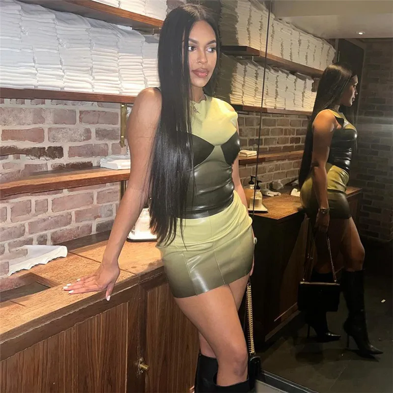 | Product Name | Summer Women’s Fashionable Pu Vest High Waist Contrast Color Bodycon Skirt Two Piece Set |
