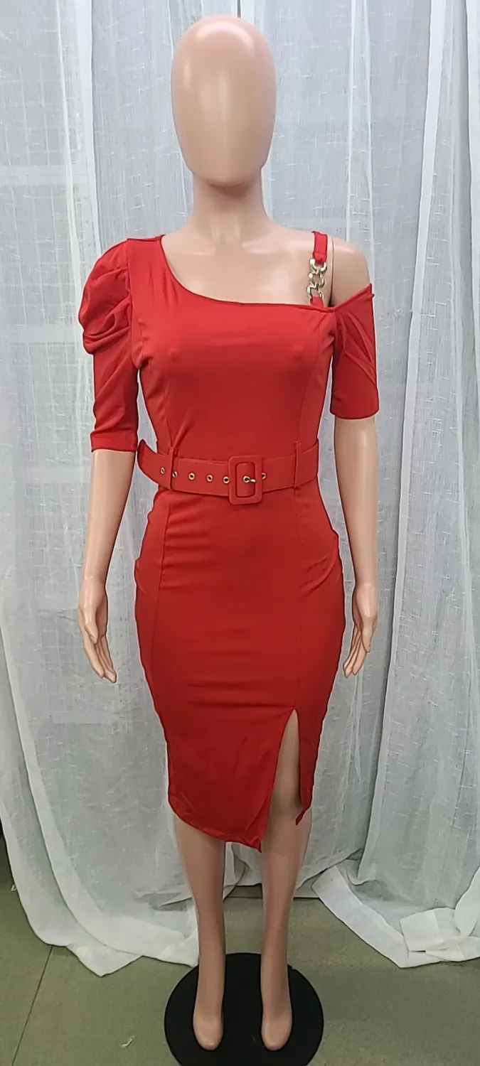 | Product Name | Women Clothes Slash Shoulder Metal Chain Strap Slit Office Dress With Belt |