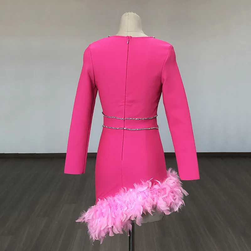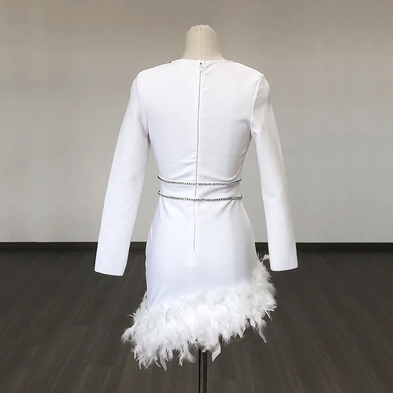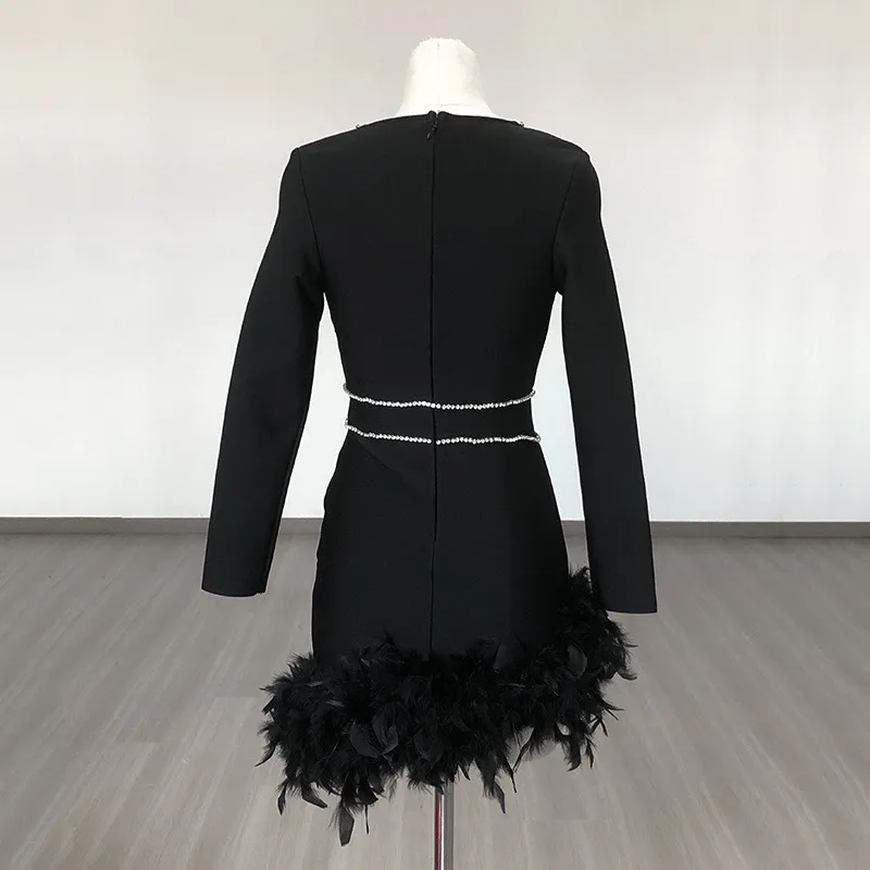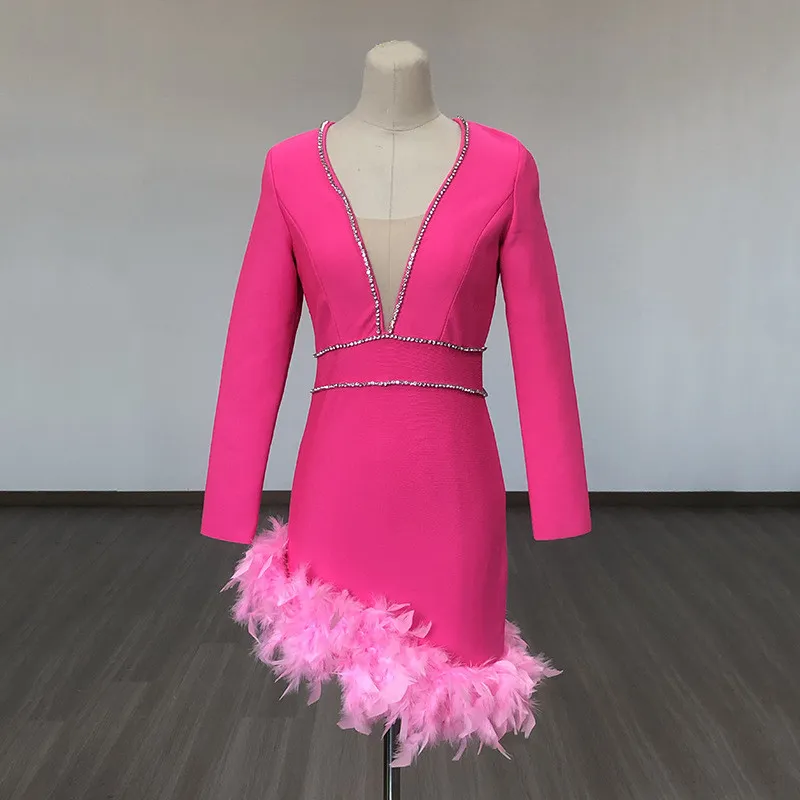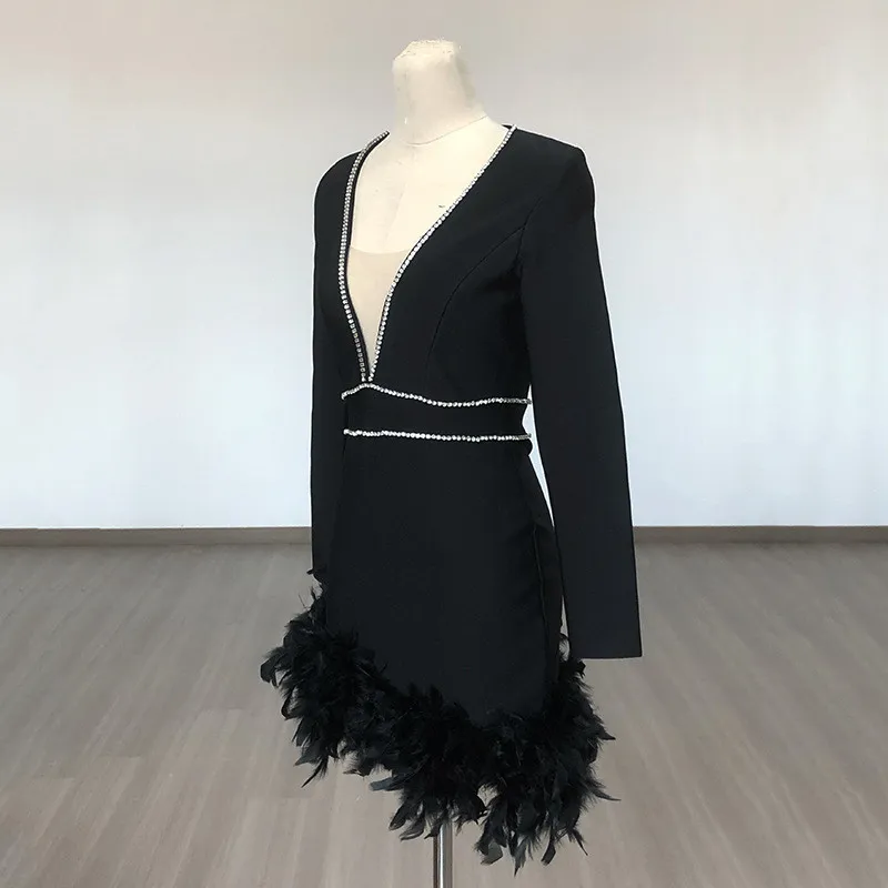 | Product Name | Women French V Neck Patchwork Diamond Long Sleeve Feather Bandage Dress |