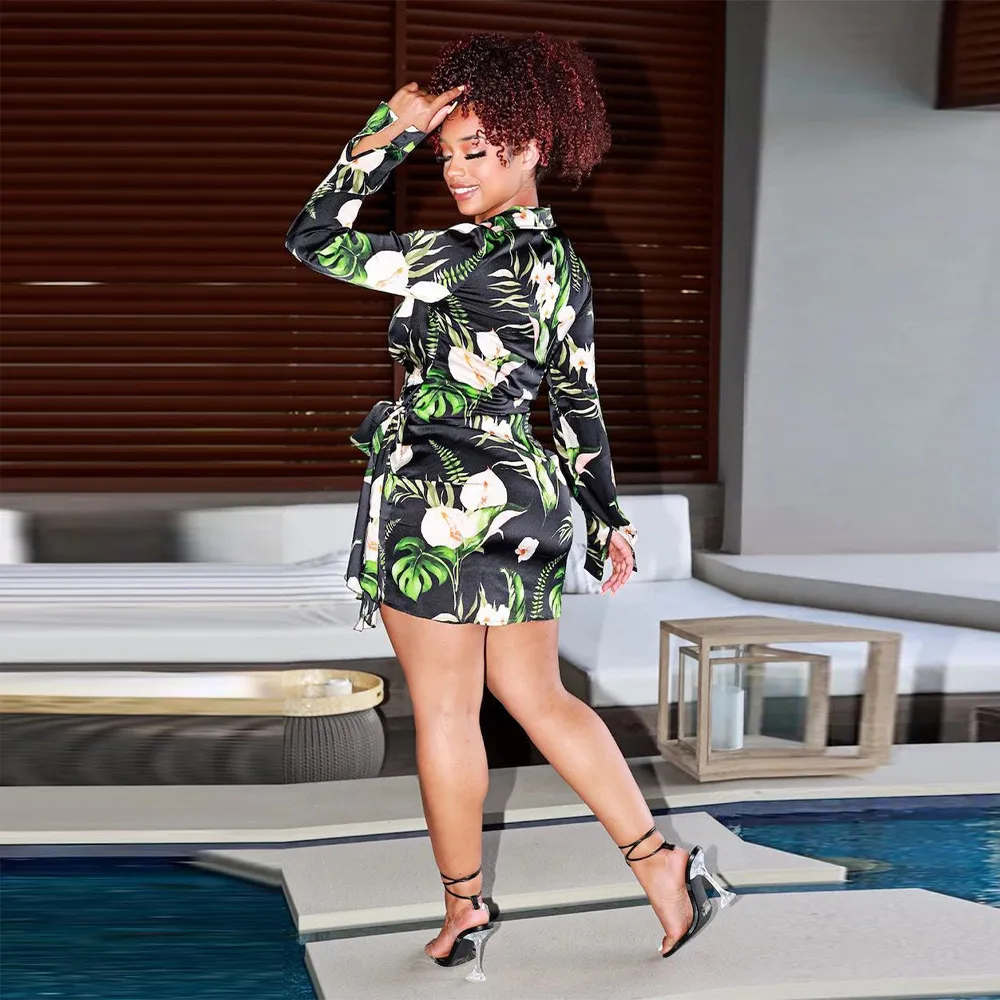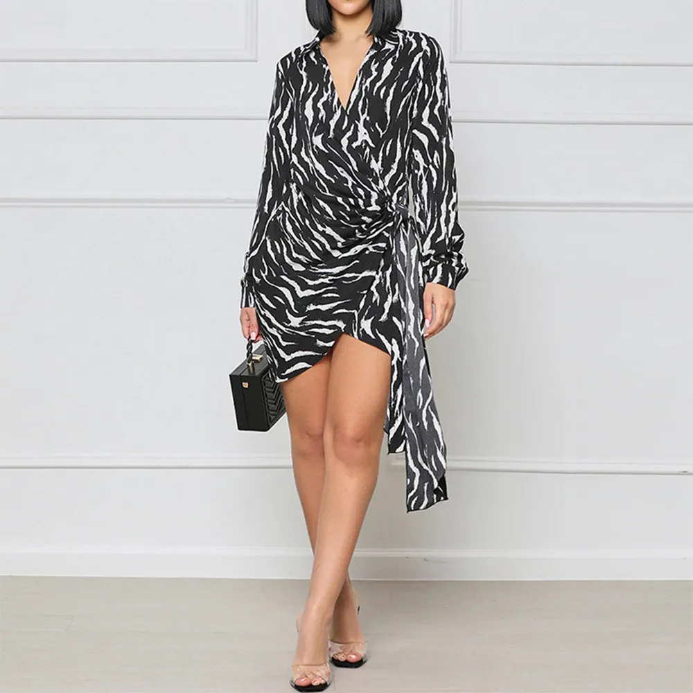 | Product Name | Women Printed V-neck Tie Waist Long Sleeve Irregular Dress |
