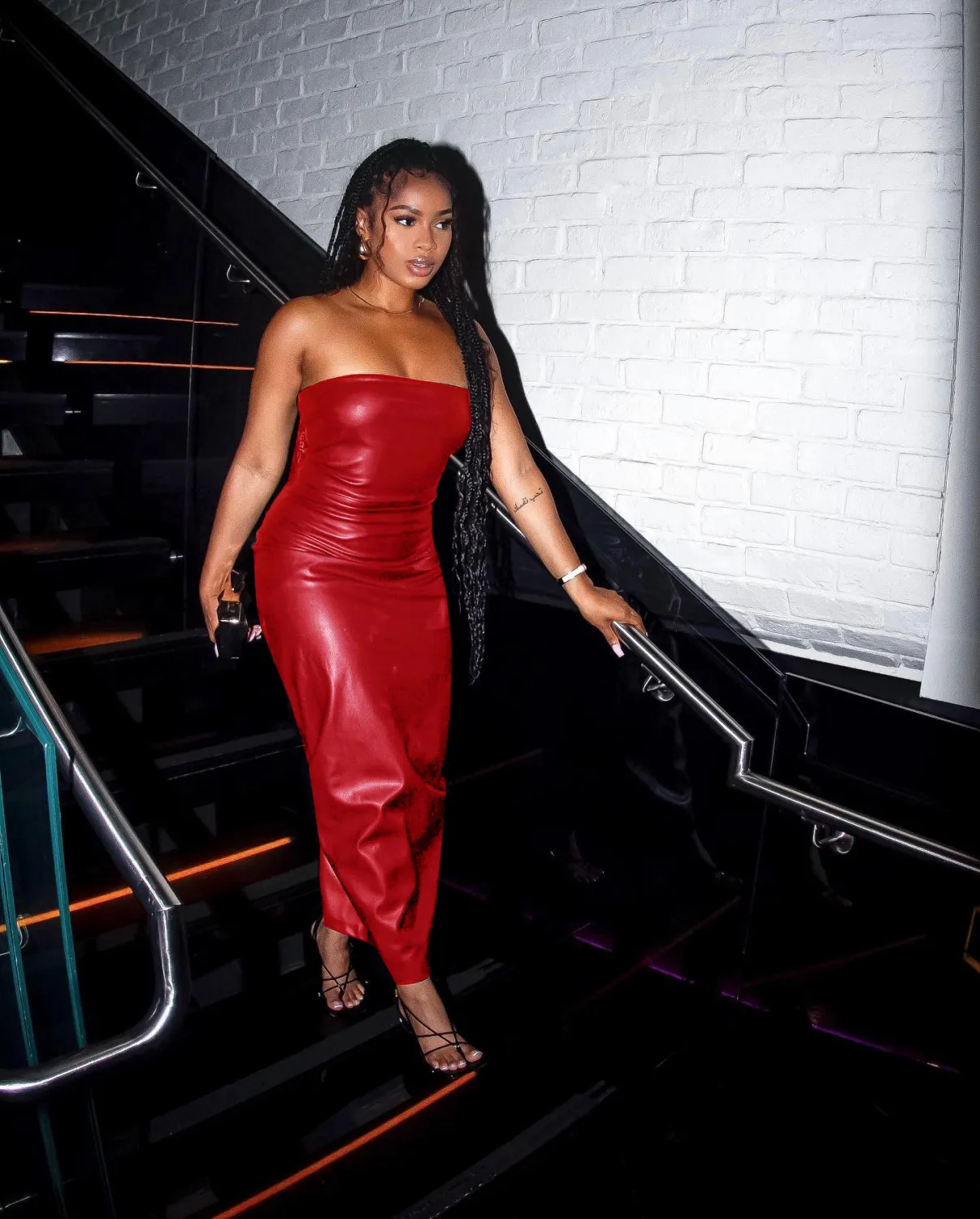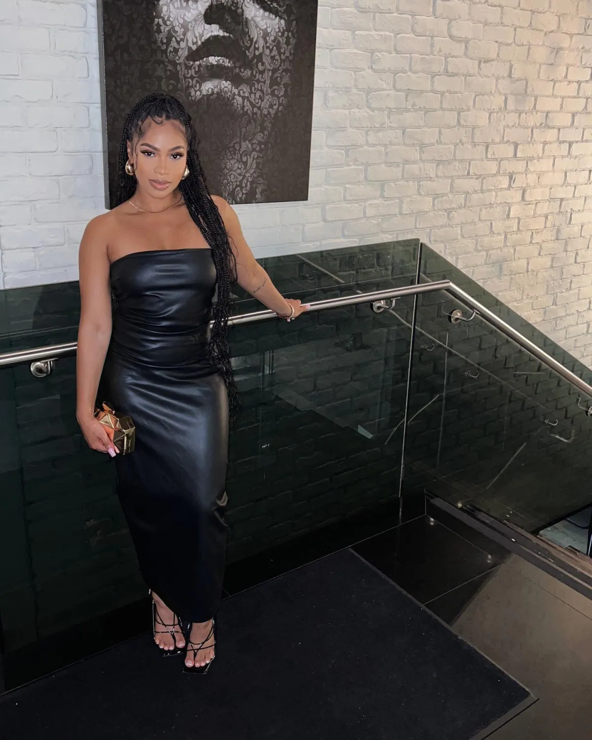 | Product Name | Women’s Clothing Pu Leather Strapless Slit Long Dress |