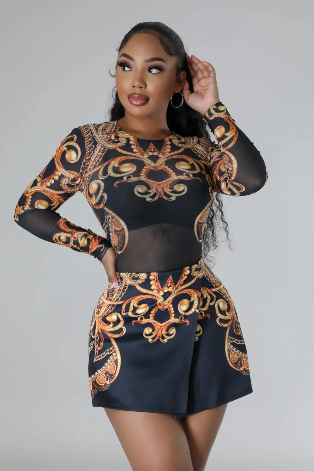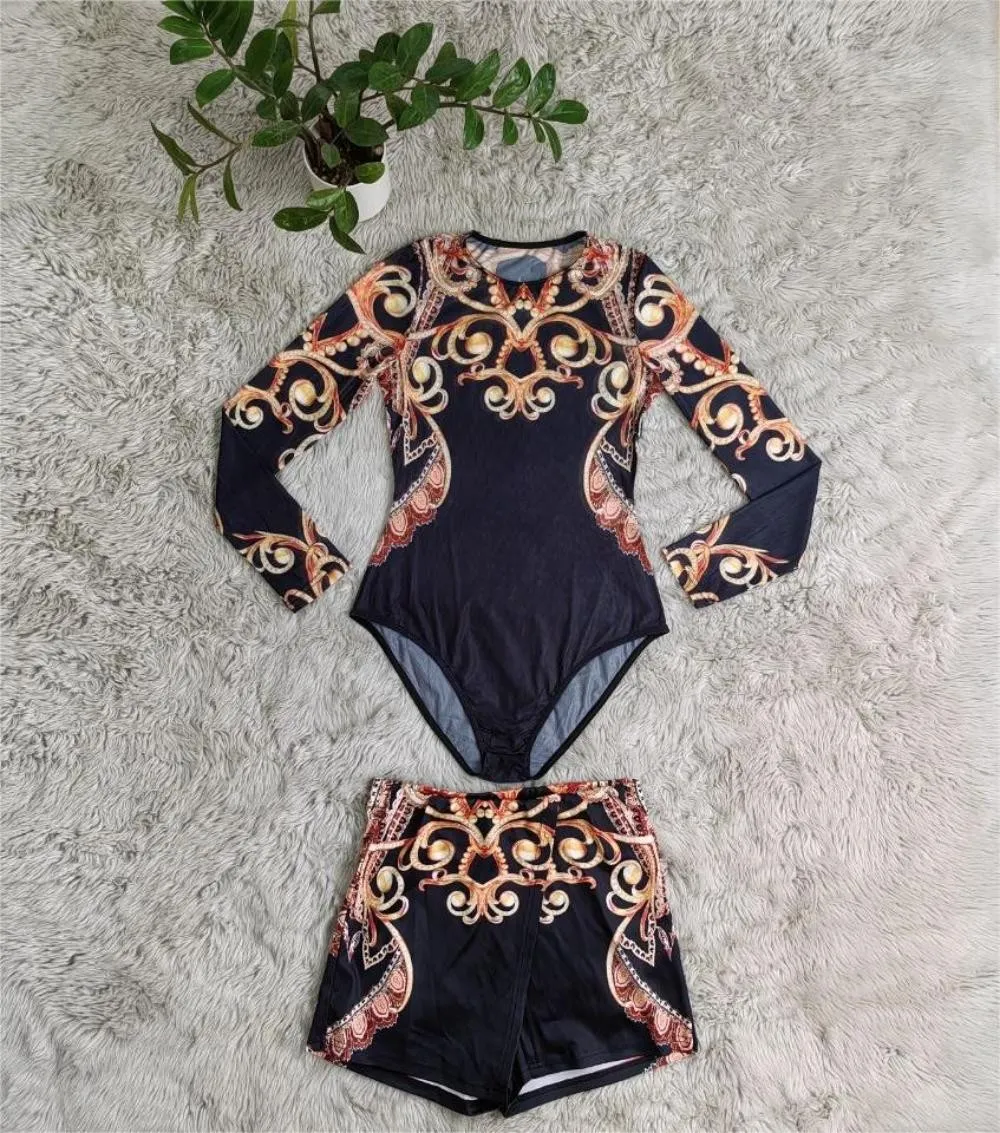 | Product Name | Women’s Fashionable Sexy Printed See-Through Mesh Bodysuit Shorts Two-Piece Set |
