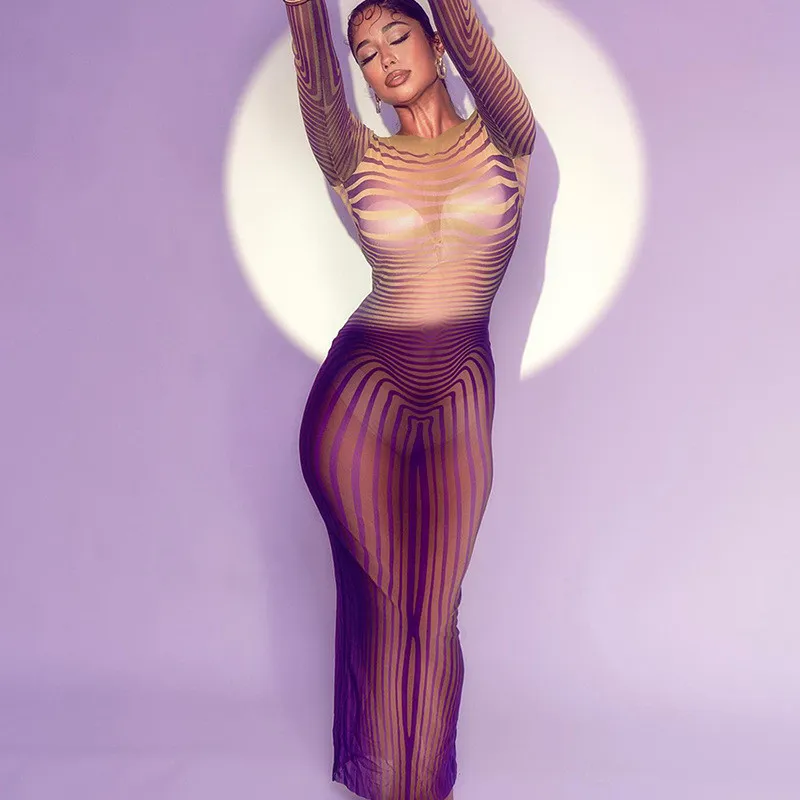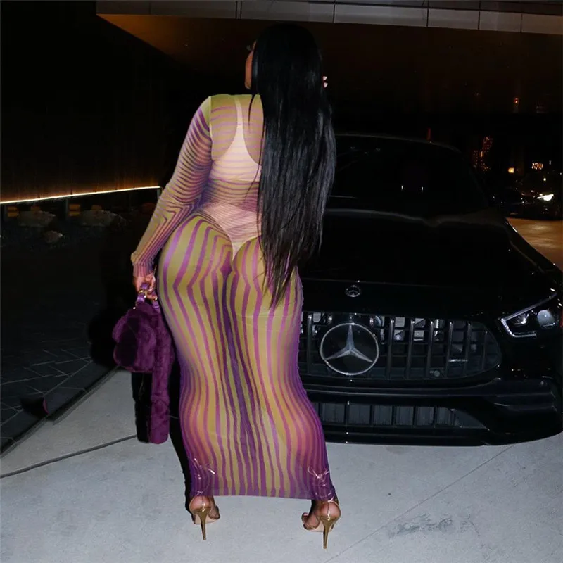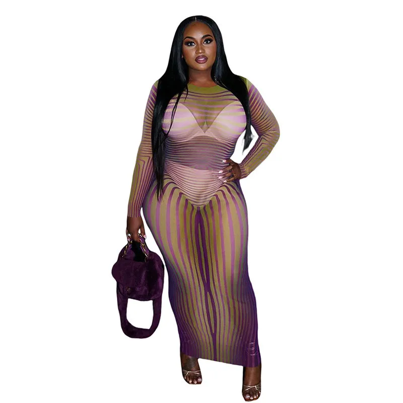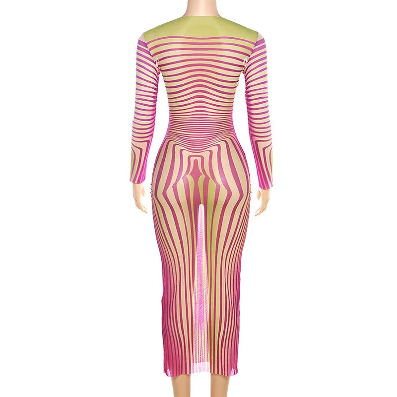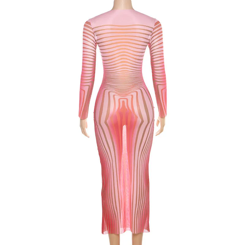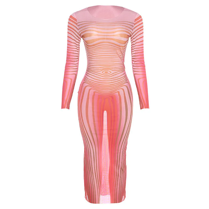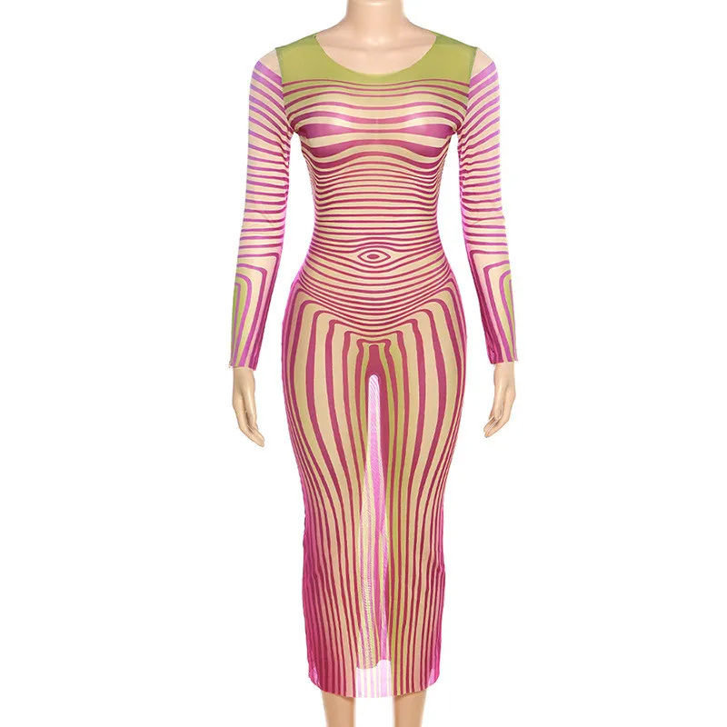 | Product Name | Women’s Summer Round Neck Pullover Striped Mesh Print See-Through Sexy Slim Bodycon Dress |