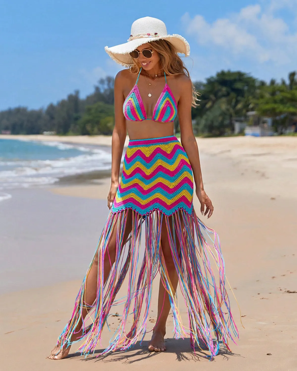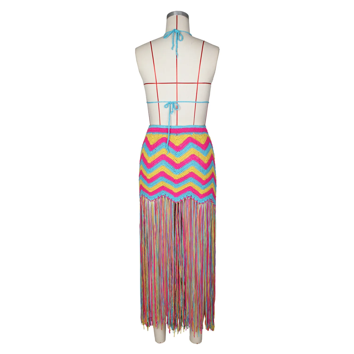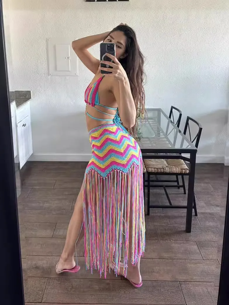 | Product Name | Women sexy crocheted wave pattern fringed beach cover-up dress two-piece set |