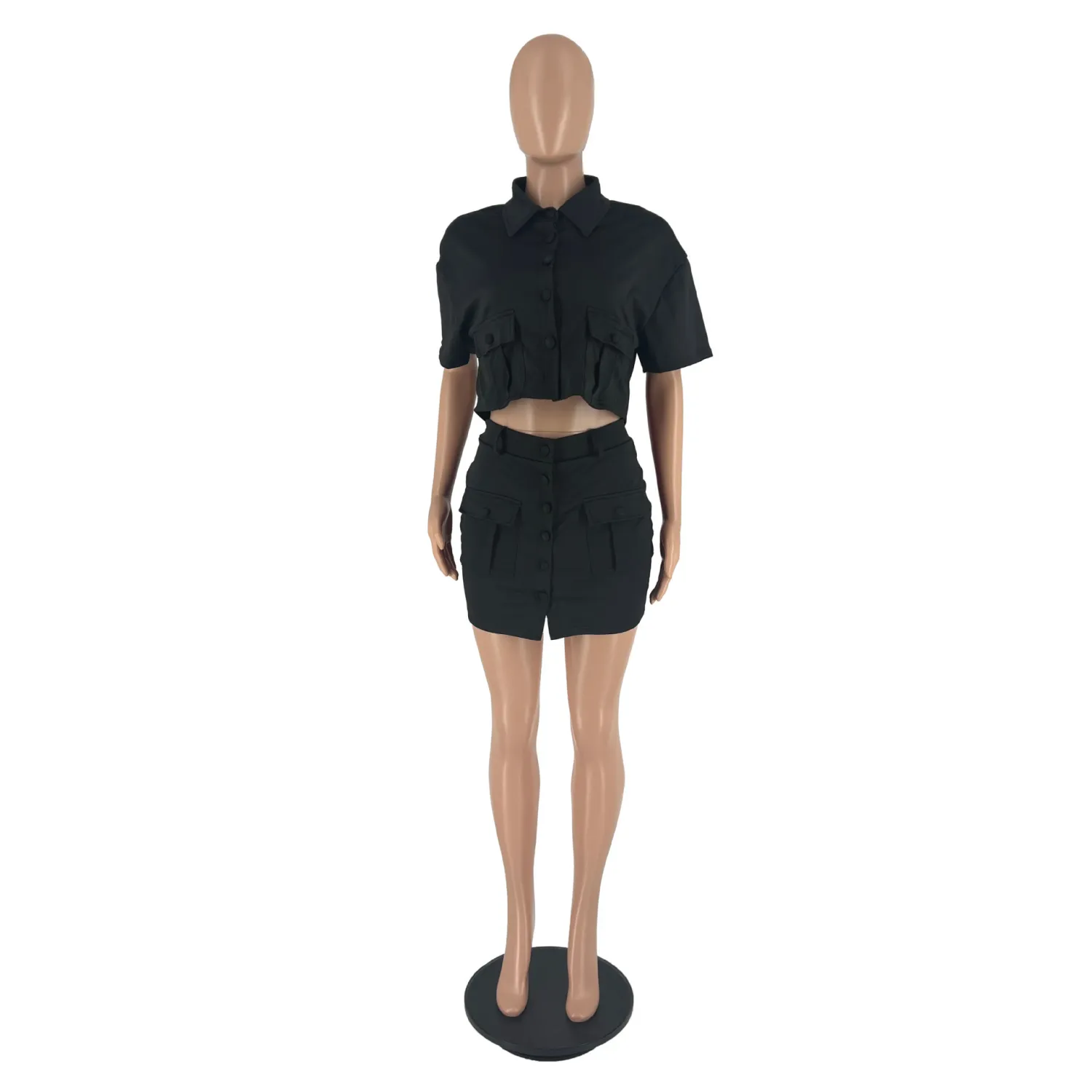 | Product Name | Women Solid Button Pocket Top and Camouflage Skirt Two-Piece Set |
